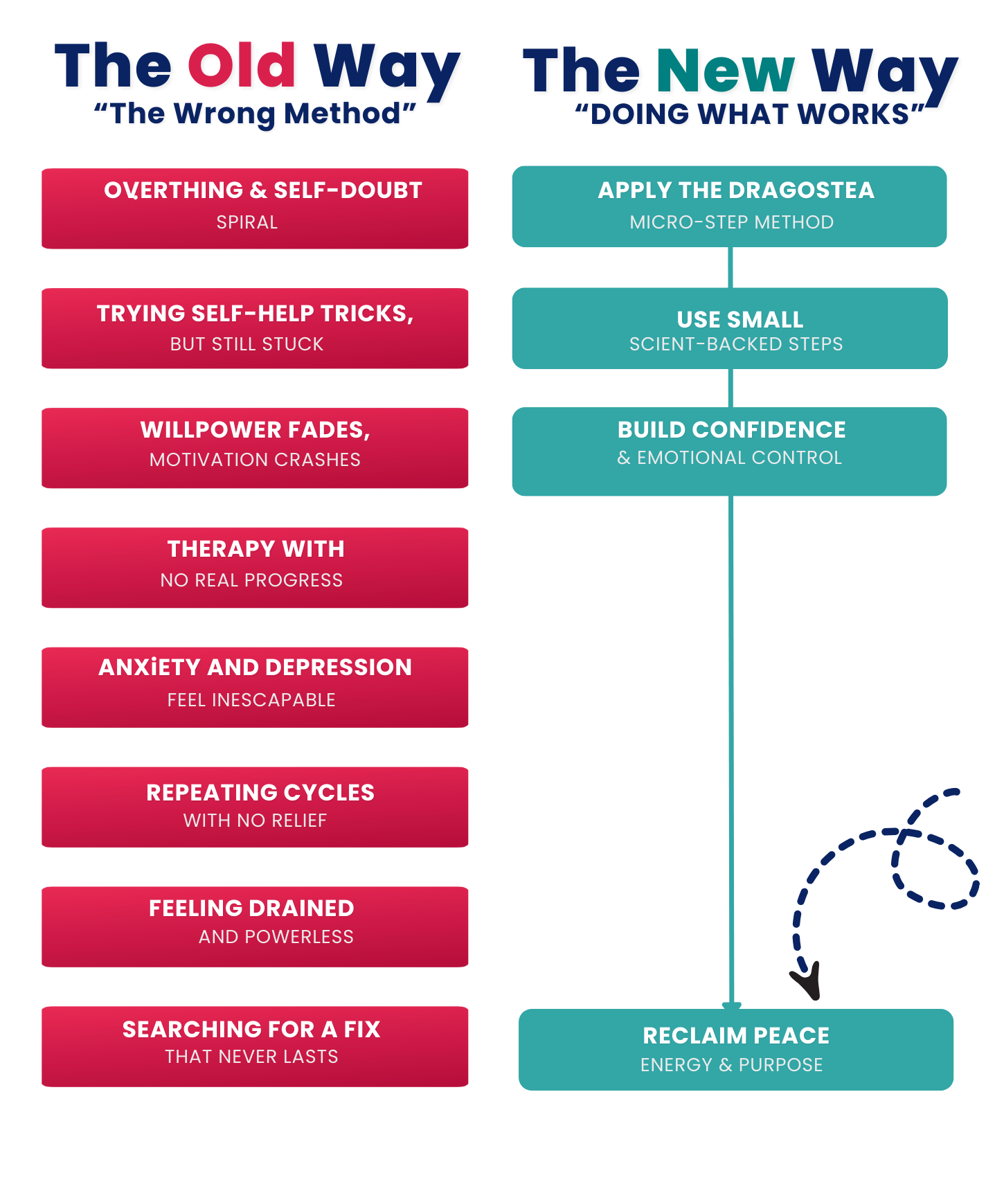Most anxiety and depression solutions rely on big, overwhelming changes—like strict therapy routines, medication, or vague self-help advice that leaves you feeling stuck. The Dragostea Micro-Step Method is different. Here’s why: